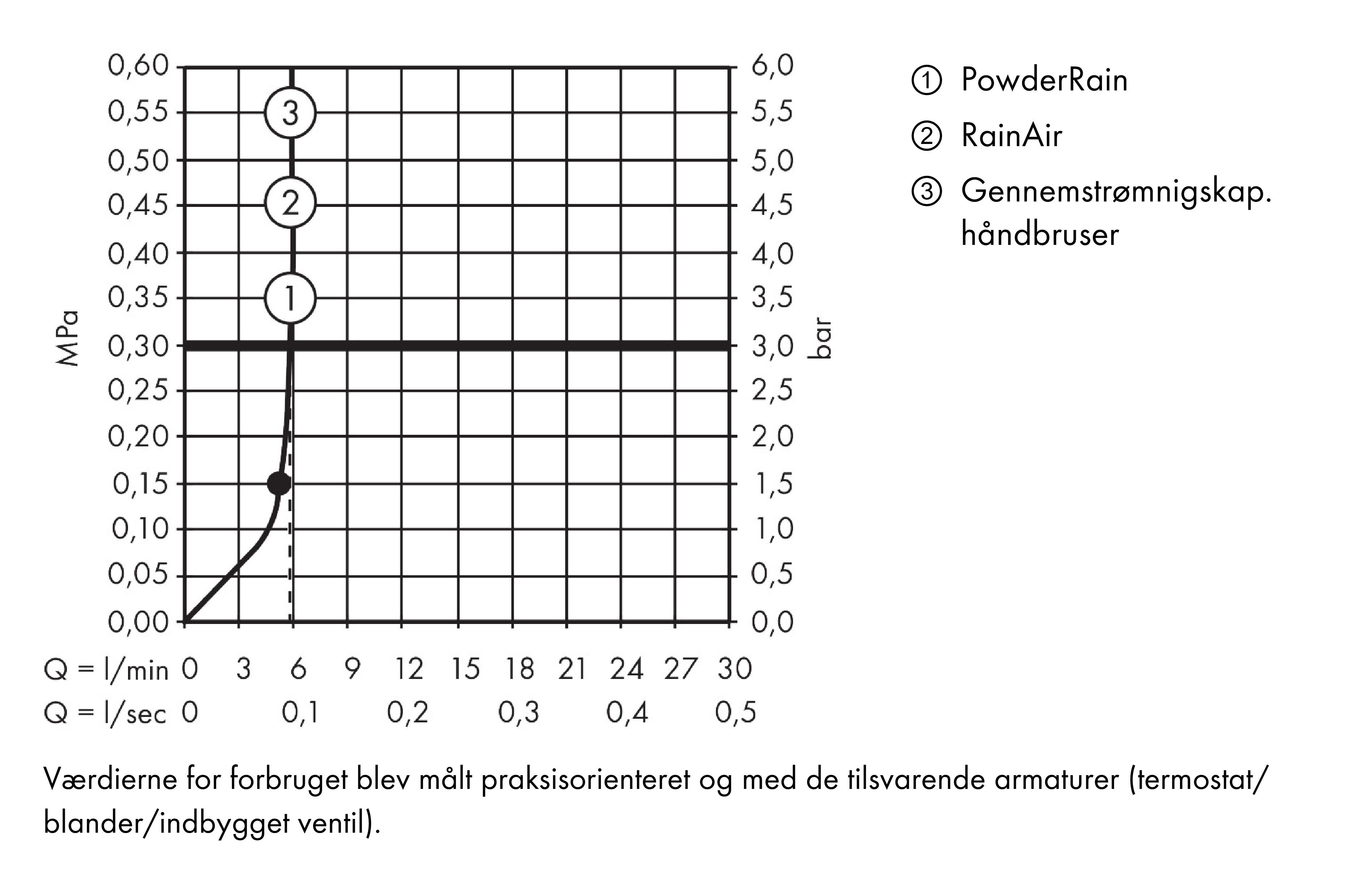 - gennemstrømningsmængde PowderRain-stråle ved 3 bar: 5,5 l/min